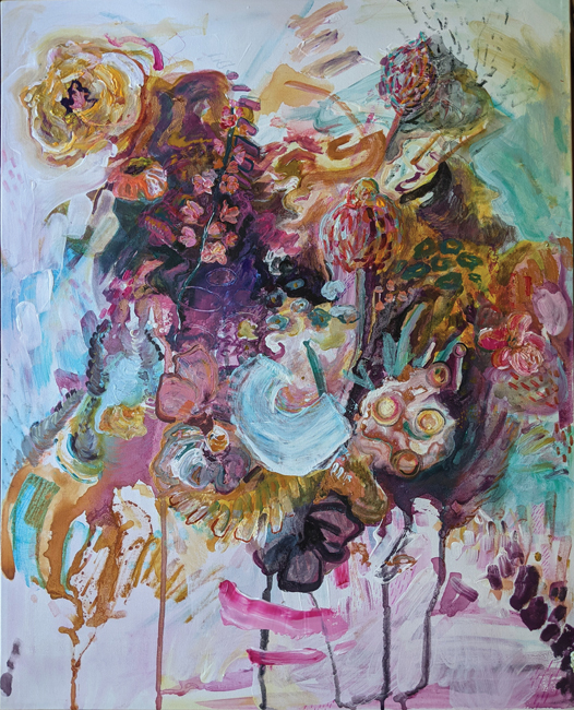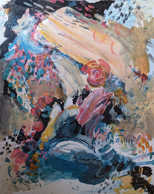 Kingsley explains her paintings are abstract expressionistic, with recognizable images and gestural brush-strokes or mark- making. “I’m very fun-focused, and I like to use lots of different colors,” says Kingsley. She adds that her art sometimes reflects her emotions.