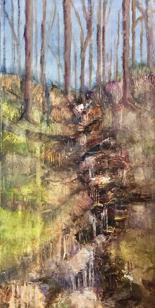 In fact, Ferrer says she finds inspiration for her oil collages in the “tactile elements nature offers,” such as the rocks, water, bark, leaves, and flower petals she finds on her own 12 acres and in nearby Yellowwood State Forest. Landscapes, water scenes, and floral still lifes are three of Ferrer’s major subjects.