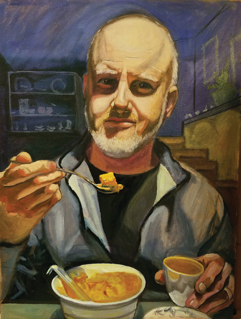 “I want them to do things they would naturally do,” she says, pointing out paintings of daughter Odessa with earbuds, son Finnian playing on his cell phone, and husband Art lifting a spoonful of food on one of their date nights. She also paints herself.