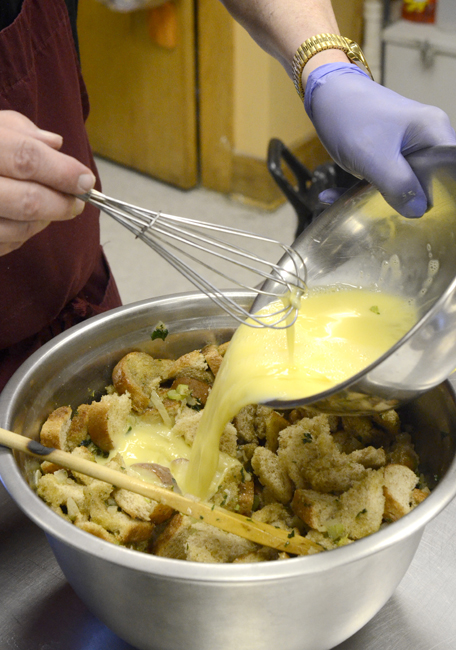 5) Whisk eggs. Then whisk 1 cup of broth into the eggs. Then combine the egg and bread mixtures.