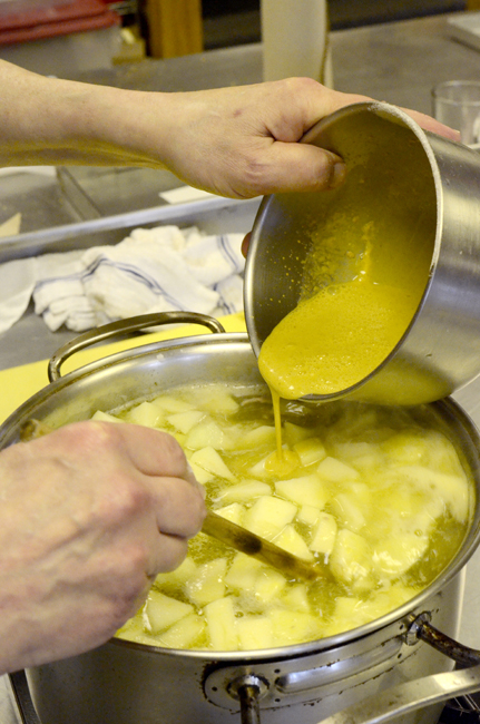 4) Incorporate curry mixture into broth with a whisk. Add thyme.
