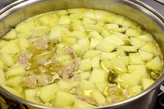 1) Simmer 1 large onion, 3 cloves garlic, and 4 of the chicken thighs in 2 quarts water until chicken is cooked.