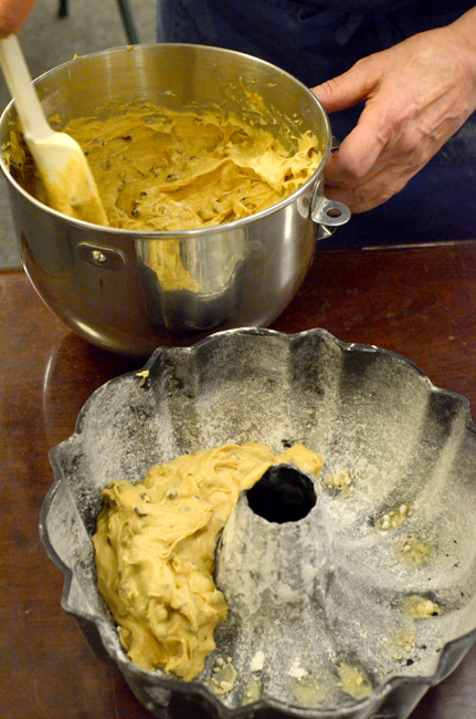 7) Evenly spoon the cake batter into the sprayed-and-floured bundt pan.