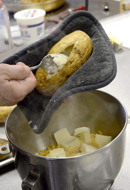 3) Using a small, sharp knife, cut a long window into the top of each potato. While holding it in a pot holder, carefully scoop out the inside of the potato. Leave enough shell to maintain a container.